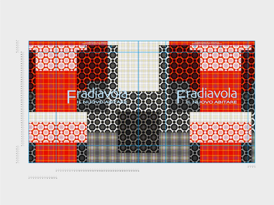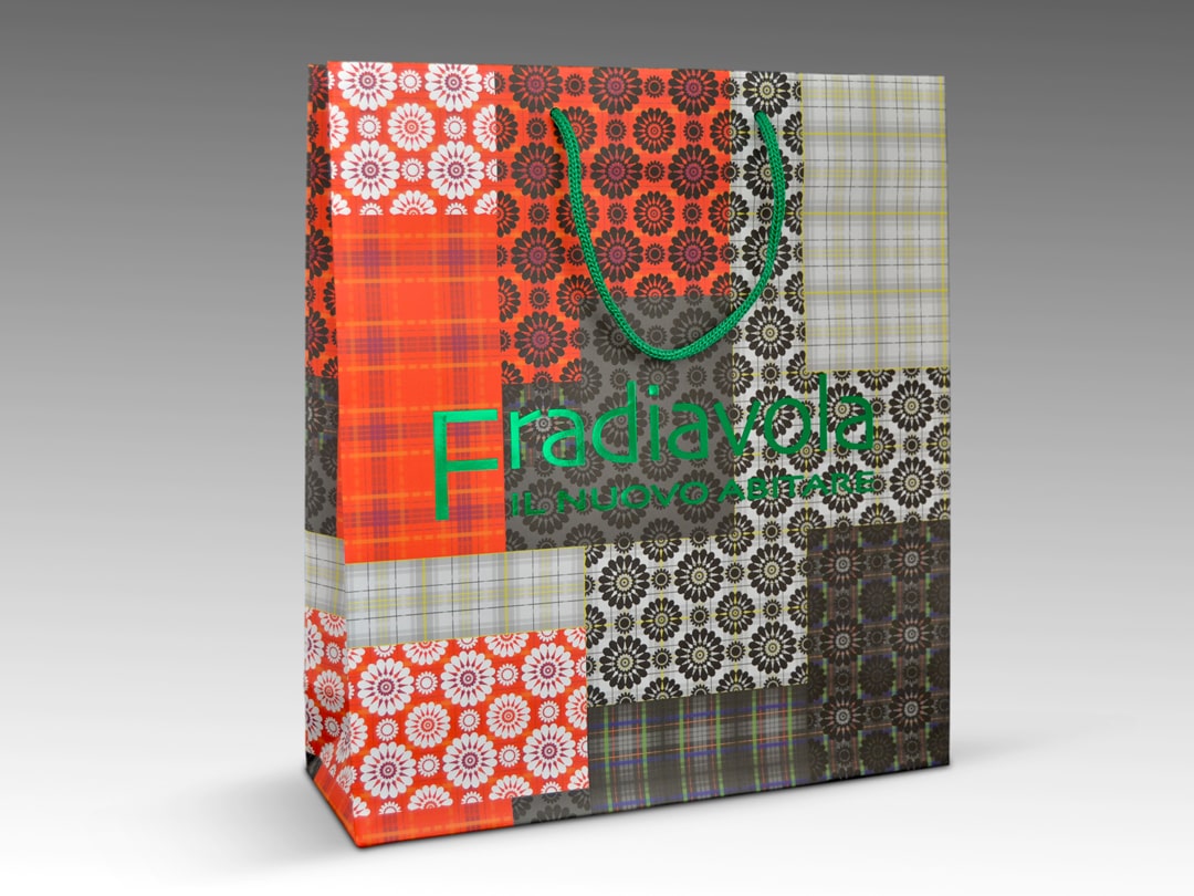 Il negozio di interior design Fradiavola ha commissionato una shopper identificativa della propria attività: è stata progettata, ivi disegnata una texture di moduli geometrici che ha avvolto la shopper, mentre il logo è risaltato grazie alla resa della stampa a caldo colore blu reflex nella prima versione e verde mela nella seconda.