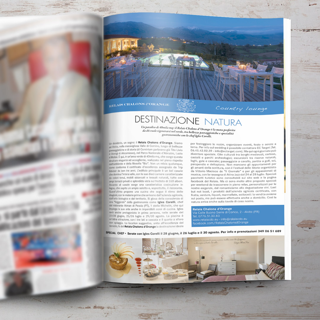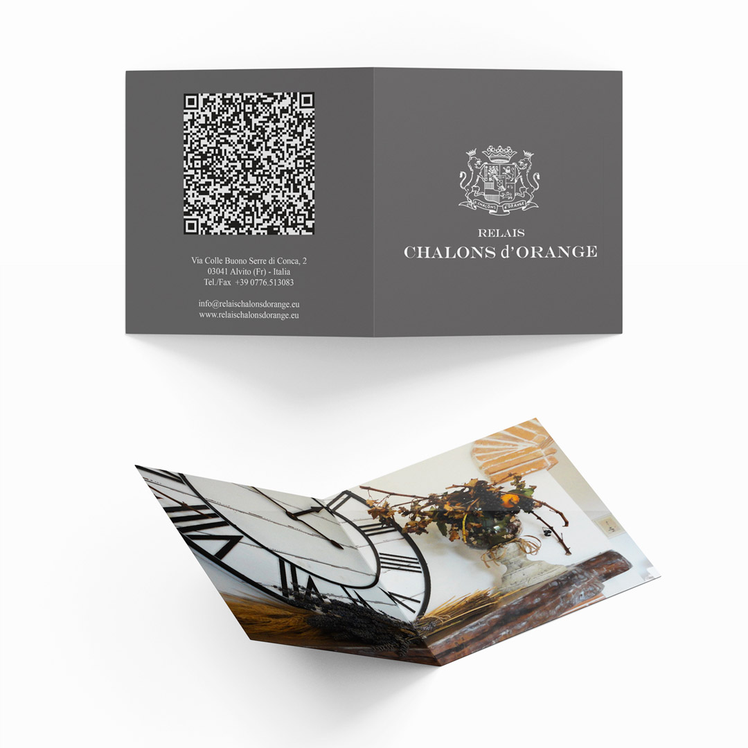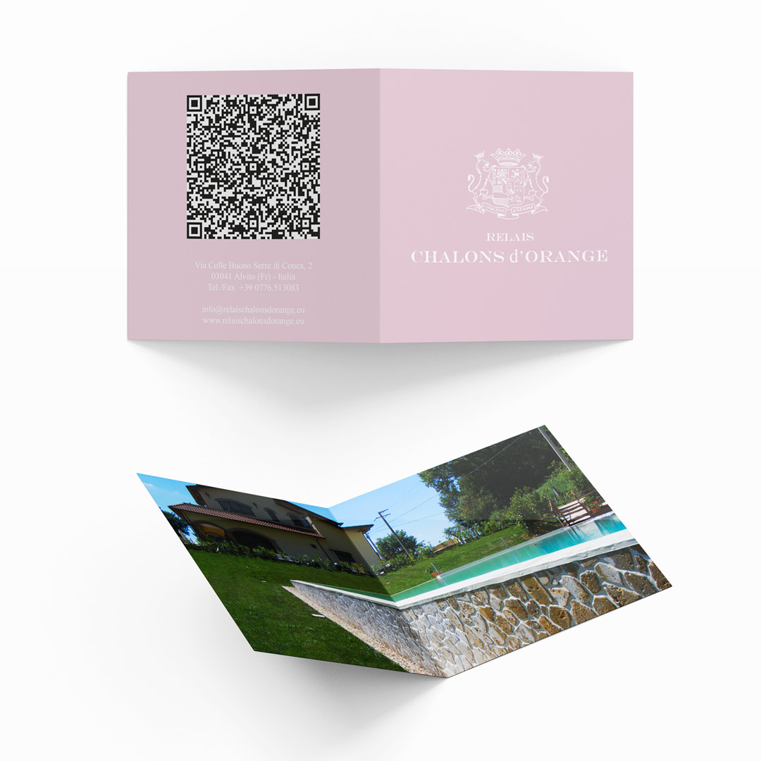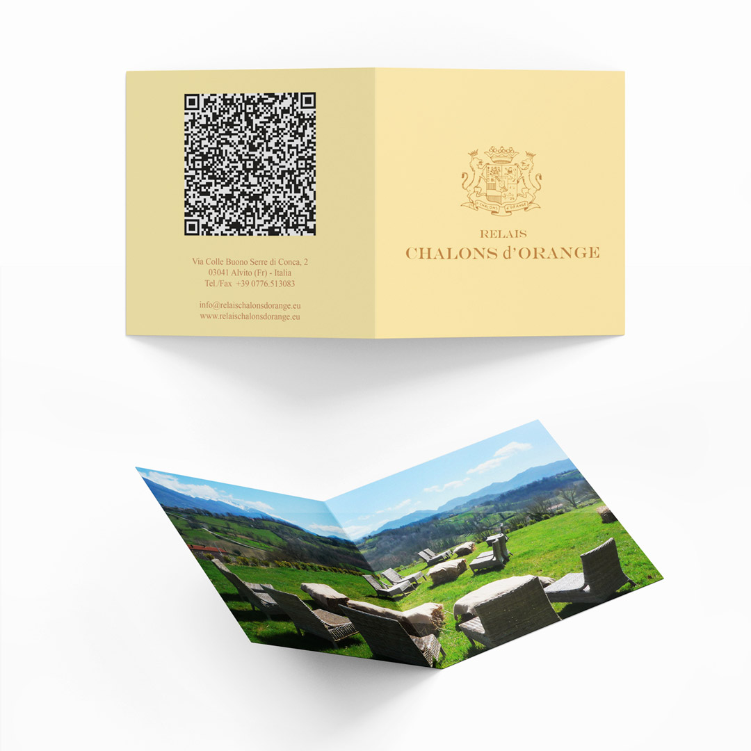 La struttura ricettiva Relais Chalons d’Orange ha necessitato – di confermare la propria identità visiva – attraverso la personalizzazione dell’abbigliamento e degli accessori propri dello staff, nonché i biglietti da visita, il blocco notes e la penna, la shopper in tnt per l’uso della piscina, le etichette packaging per i propri prodotti a km zero serviti a colazione agli ospiti, un’inserzione pubblicitaria a mezzo stampa.
