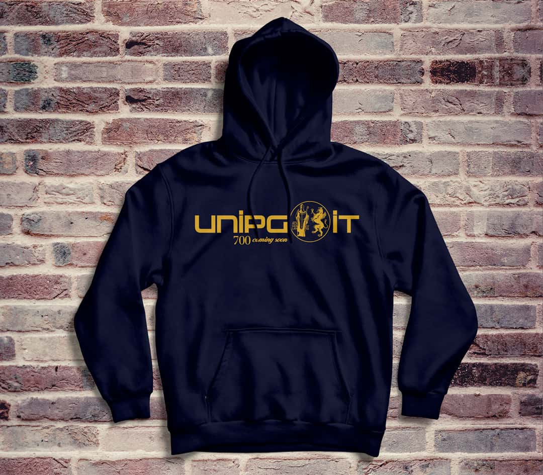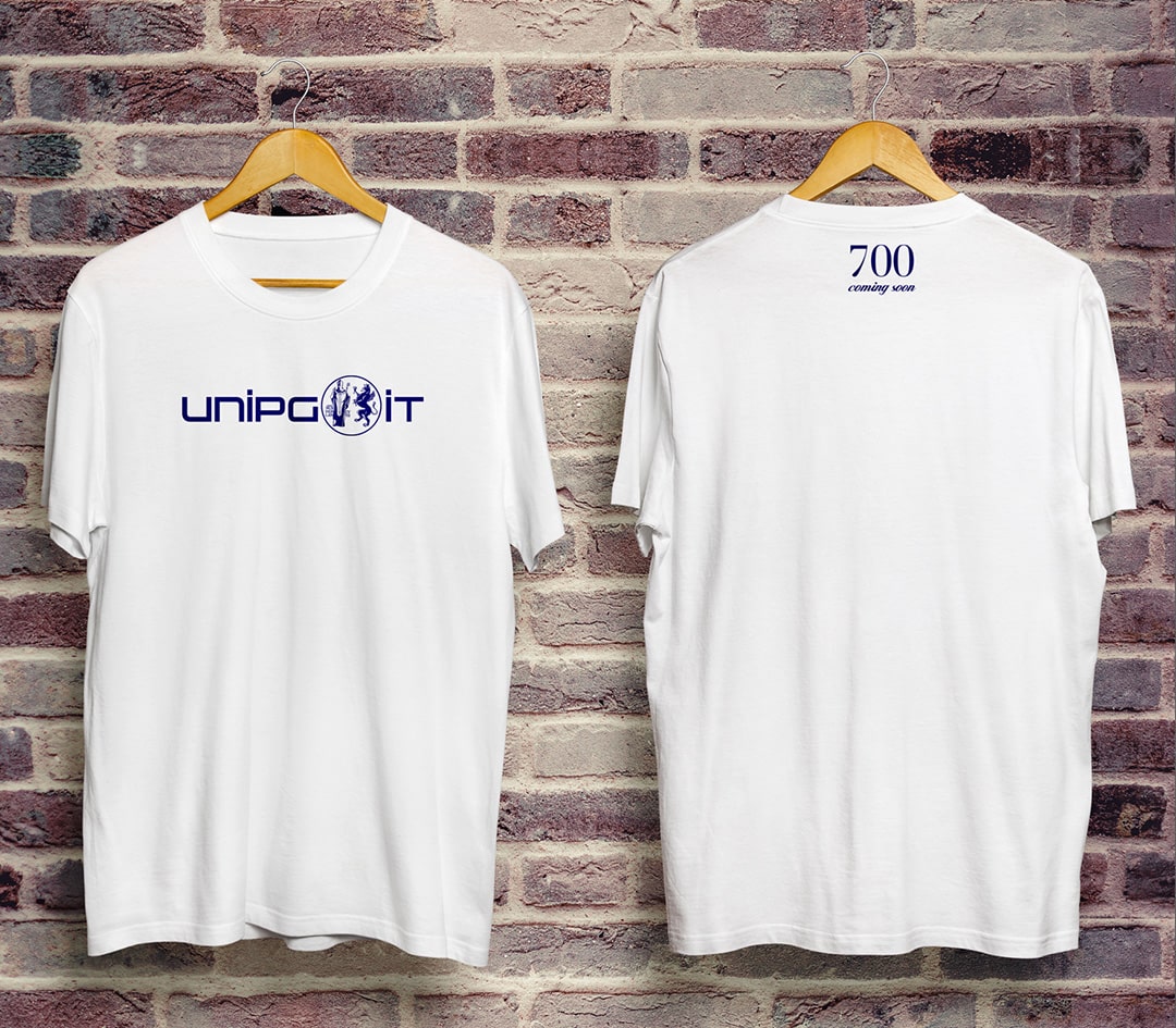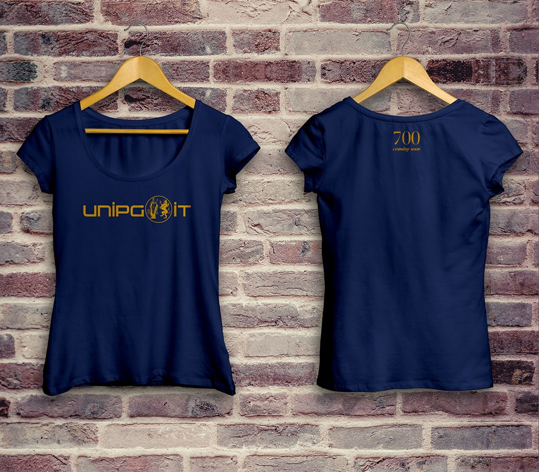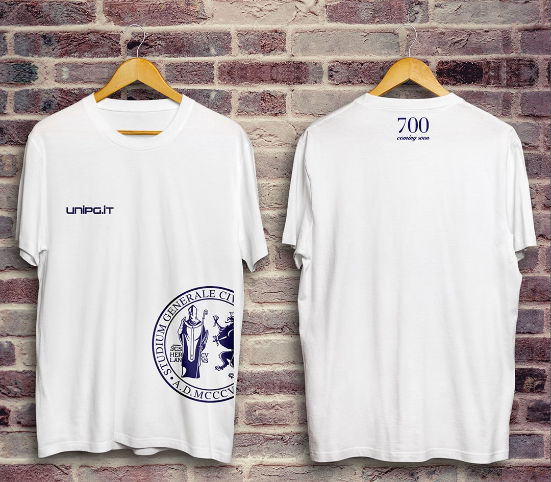 L’Università degli Studi di Perugia ha celebrato il settecentenario con il proprio brand di t-shirt e felpe che tutti, studenti e non, possono acquistare e vestire. Il marchio, progettato e declinato sui capi d’abbigliamento, ha mantenuto la propria storicità con l’antico pittogramma (che racchiude S. Ercolano ed il Grifo) unito ad un lettering moderno.